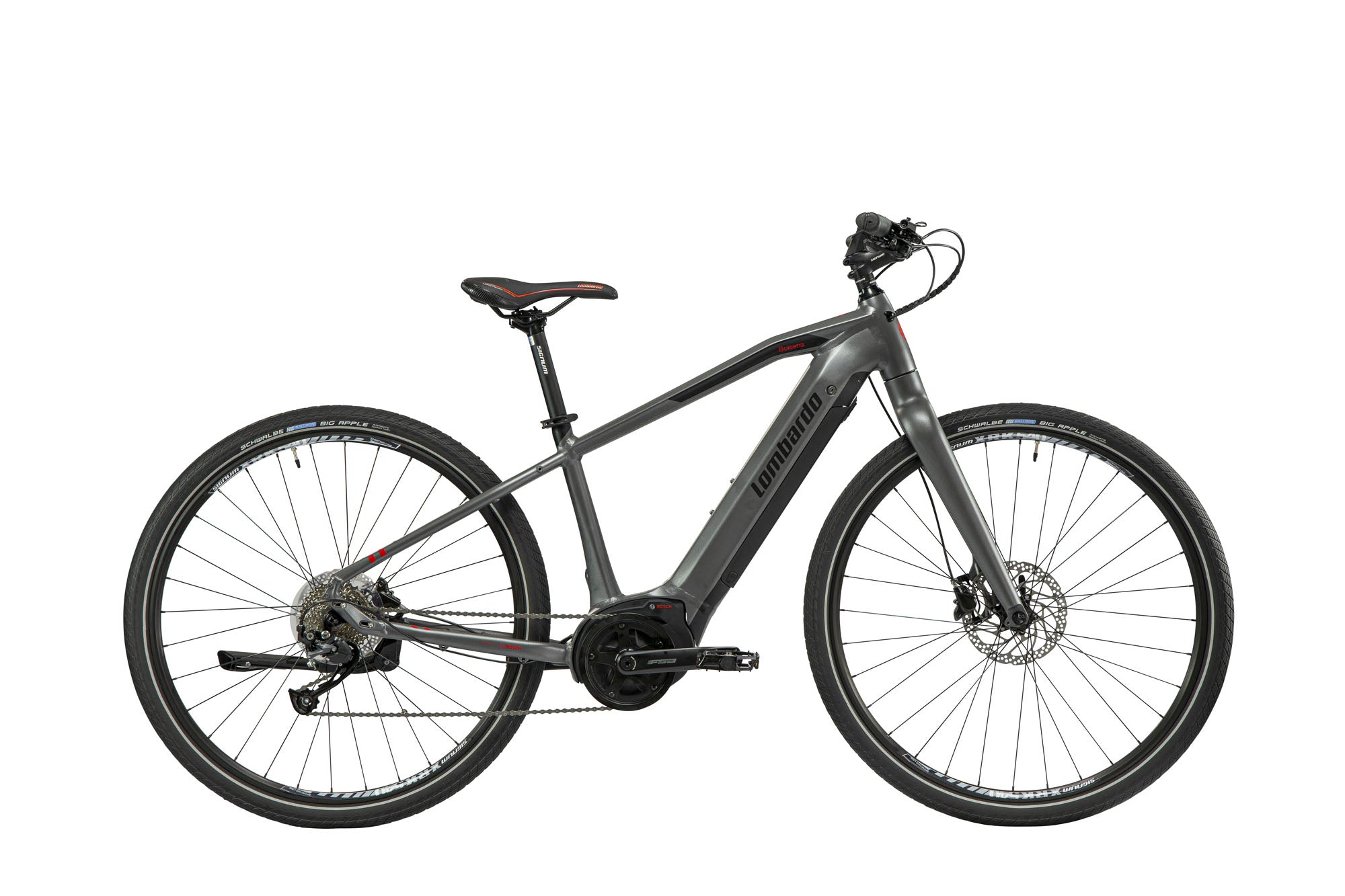 Frame:    Trekking  aluminum 6061, integrated battery; voorvork: vast;  Versnelling: Shimano Altus 9 sp; Remmen: Shimano MT200, hydraulic discbrakes; Banden: Schwalbe Big Apple 50-622 ( 28 inch); Zadel: Selle Italia X1 Elektrisch gedeelte: Motor:    Bosch Performance Line 36V / 250W (G3) Batterij:    Bosch PowerPack Li-Ion 500 Wh;  2A charger Autonomie:    <  120 km (eco) Maximum snelheid:    25 km/h Display:    Bosch Kiox LCD separate control unit Standen:    4: Eco – Tour –Sport – Turbo Walk-functie:    <  6 km/h 21,3 kg
