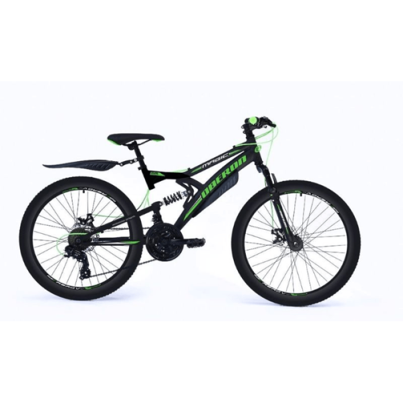 nieuw model, oversized dubbel geveerd MTB kader, Shimano 6 sp, microshift + mechanische schijfremmen, verende vork, spatborden.